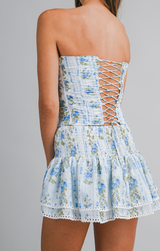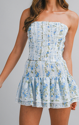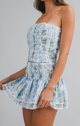 The Coretta set is the picture of summer charm! Featuring a corset-style tube top with a lace-up back and eye-catching ruching throughout, paired with a micro mini skirt complete with shorts underneath for the perfect amount of coverage. Style with gold and pearl jewelry and strappy sandals!