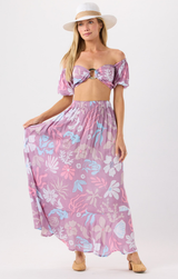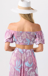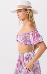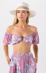 The Sirena Top is your ticket to effortless charm. This ultra-cropped beauty features playful puff sleeves that add just the right amount of drama, a sweet sweetheart neckline, and a delicate mother-of-pearl ring detail at the bust for a touch of coastal glamour. Dressed in a beachy print, it's the perfect piece to layer, pair with the matching skirt, or wear solo with cut off denim for those sun-kissed moments that call for something short, fun, and undeniably cute.