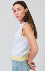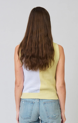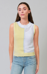 A sweet sleeveless shell that can be styled up with trousers and loafers for an office vibe or casually with light wash cutoffs and sandals for an everyday summer vibe. Featuring a contrast whipstitch detailing that adds subtle texture and definition, sleeveless design, color block detail, crew neckline and a soft knit.