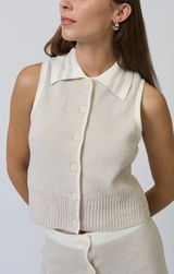 A moment for the cute vest trend! This sweet knit is made of soft tweed yarn, collared neck, button up front, ribbed hem and a slightly cropped length. Style with tailored trousers and loafers for a polished everyday look.
