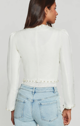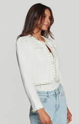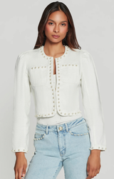 A clean and classic denim jacket for your light layering looks. Featuring pearl-trim detailing, front patch pockets, and a clean, collarless neckline. Style over a fit tank and light wash denim with heels for a Friday date night vibe.