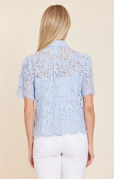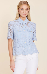 A feminine take on your classic button up blouse. Featuring dainty scallop lace trim, patch front pockets, collared neck and pearl style buttons. Style with white denim and heels for a party ready look.