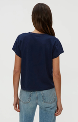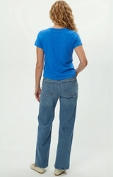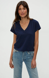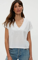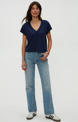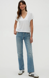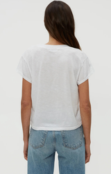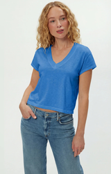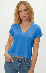 An everyday tee that is both versatile and comfy. Featuring an airy relaxed fit, v neckline, short sleeves, slightly cropped length and soft cotton. Style with cut off shorts and sandals for an easy summer look.