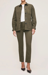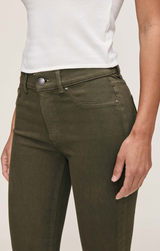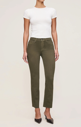 The Mara is a mid-rise, ankle length straight leg jean designed for a sleek, flattering fit. Built with Intasculpt technology, it smooths, sculpts, and flatters every curve. The Trellis wash is a muted, earthy green with subtle details, including silver hardware, tonal stitching and a raw hem.