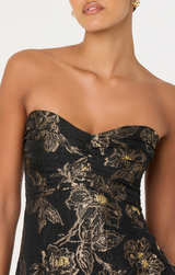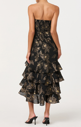 Elevate your evening with the Marysia Dress.  A show-stopping strapless midi that commands attention. The sweetheart neckline frames your silhouette beautifully, while dramatic tiered ruffles cascade down the skirt for movement and flair. Rich black fabric punctuated with gleaming gold accents creates an effortlessly chic contrast that works from cocktail hour to late-night celebrations. Dress it up and own the room.