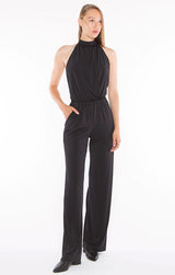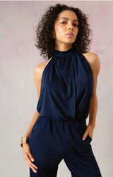 draped, microfiber jumpsuit features a gathered elastic waist and pockets with a tied neckband. Designed to impress while still feel protected and covered. Pair with sparkly jewelry and heels or sneakers and a denim jacket.