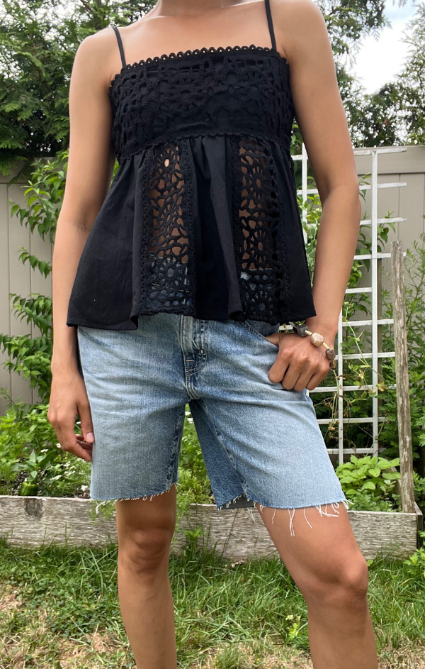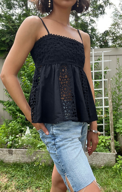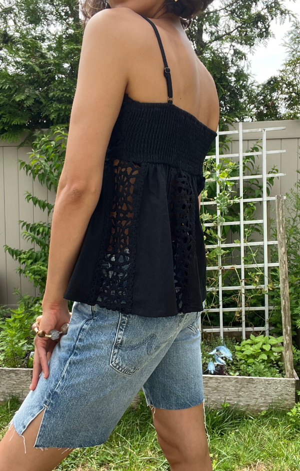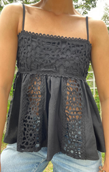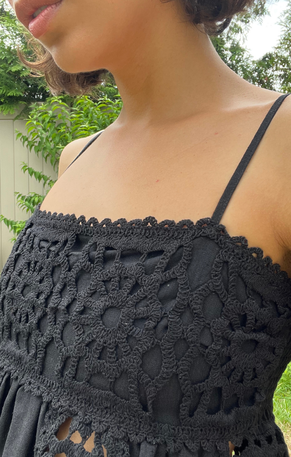 This sweet summer top masters the boho vibe! Featuring a charming babydoll-style cut, spaghetti straps, and crochet details throughout the garment. Style with your denim of choice or a patterned maxi skirt!