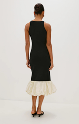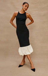 The Cheryl Dress combines modern elements with a timeless look. Featuring a fitted silhouette, ribbed knit body, sleeveless design, midi length, and a fashion-forward bubble hem at the bottom of the skirt in a contrasting ivory color. Pair with a beaded handbag and heels for your next special event!