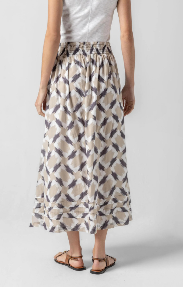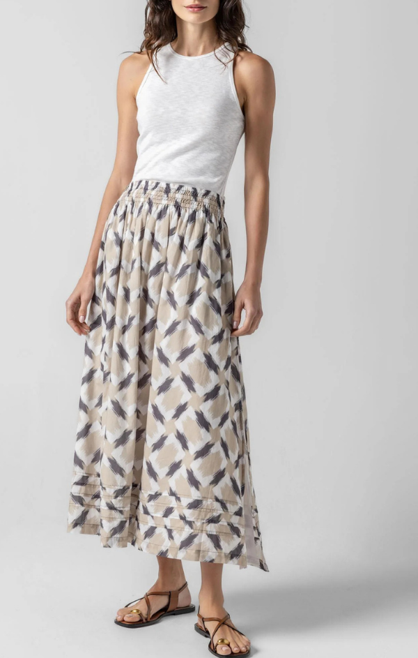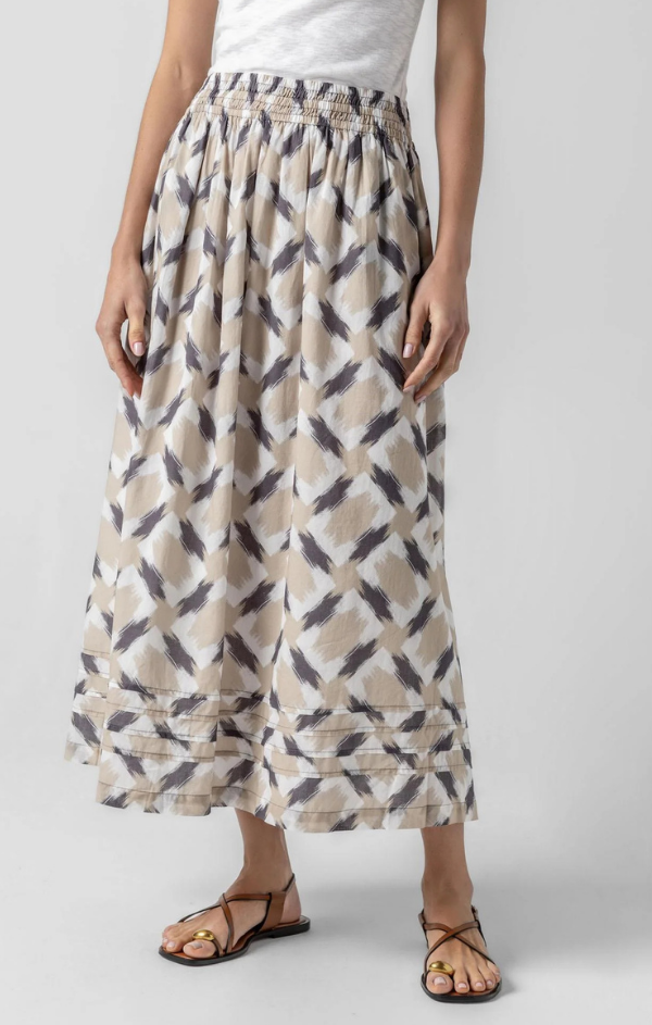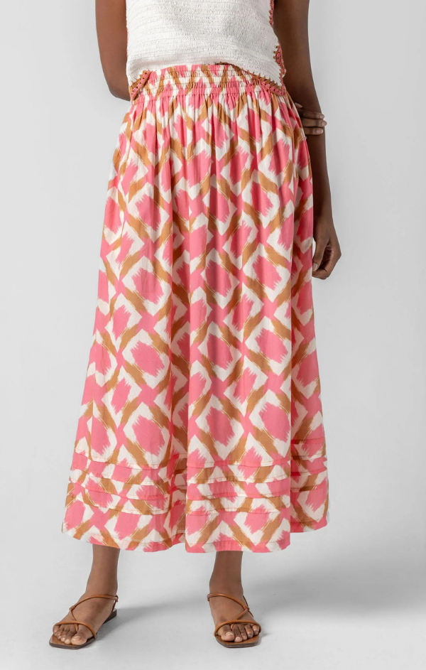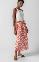 An ultra flattering and easy to wear midi skirt featuring a fully lined midi length, elastic waist, unique ikat print and a breezy cotton. Style with a simple white sleeveless tank or the matching cleo crochet tank.