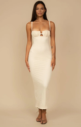 Effortlessly feminine and timelessly chic, the Crochet Petal Long Slip Dress features a flattering, fitted silhouette in a soft neutral cream hue. Designed with a supportive underwire top, keyhole front cut-out, and open back detail, this ankle length style captures understated elegance with a modern edge.