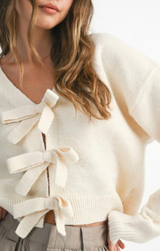 A best selling style back for another holiday season! Now in a soft cream color featuring, a 3 bow front, long drop sleeves, slightly cropped length and a v neckline. Style with a sweet mini skirt and boots! P.S. This can be worn with the bows in the back for a different style vibe!