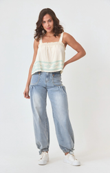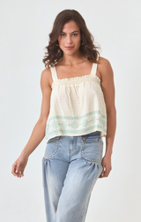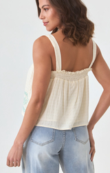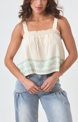 The Mandy Top is a summer staple with elevated details. Featuring a chic contrasting embroidered print, wide over shoulder straps, classic square neckline, a flirty cropped length, and gathered elastic shirring at the neckline for your perfect fit. Style with your favorite denim shorts or pair with a cotton maxi skirt for a more feminine look.