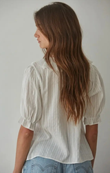 Add a feminine and versatile touch to your closet! This breezy blouse features delicately puffed sleeves, a classic V neckline adorned with ruffle details, sheer striped elements, and a comfortable relaxed fit. Create an on-the-go look by pairing with your favorite denim or style with tailored slacks for an office-ready ensemble!
