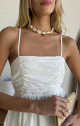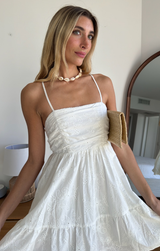 This cheeky mini can't wait to come on your next vacation. Featuring adjustable tie straps that cross into an open back design, eye-catching embroidered eyelet detailing, a ruffled tiered element at the skirt, and vertical ruching at the bodice to create a flattering fit. Style with a raffia handbag and strappy heels for the perfect summer look!