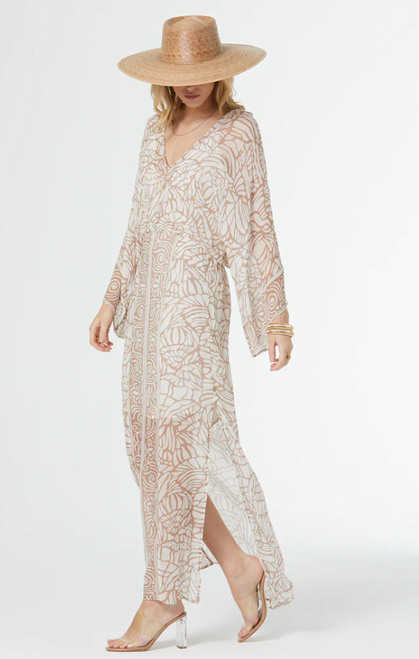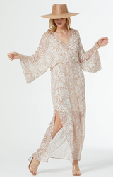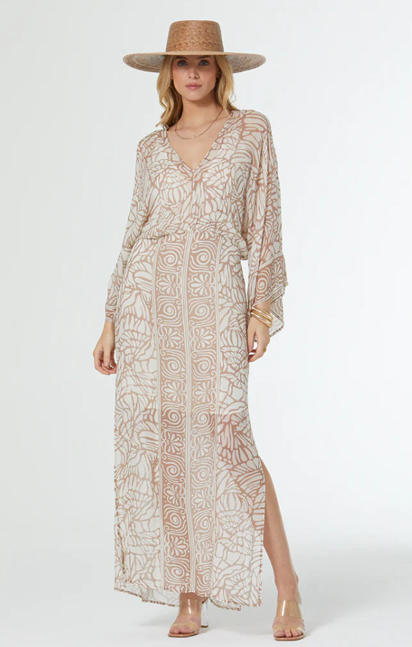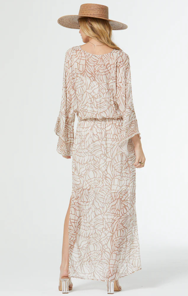The perfect summer maxi that is giving major beach vibes. Featuring a v neckline, kimono wide sleeves, dune shell print, chiffon fabric and side slits. Style with heels or sandals for a summertime look.