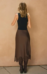Slip into this sweet skirt for an effortlessly cool ensemble. Featuring lace detailing at the bottom hem, an elasticized waistband, and a silky satin construction. Pair with blouses, tees and button downs alike!