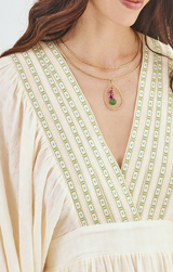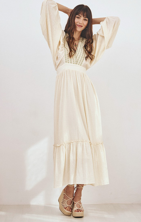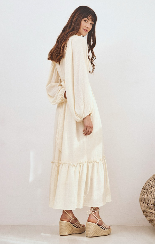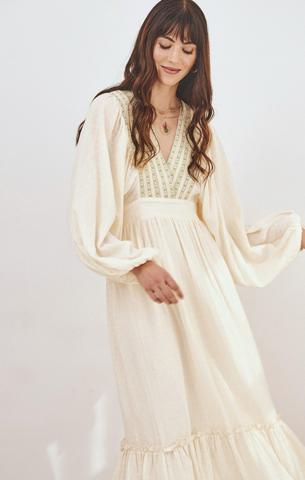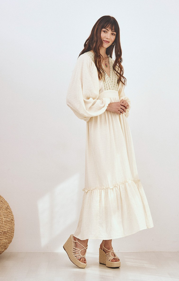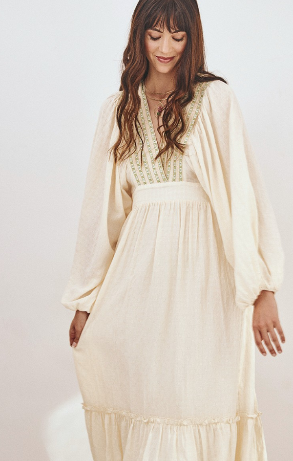 The Runa is ready for anything. Featuring a maxi length, classic V neckline with chic embroidered ribbon details, long puff sleeves with elastic at the cuffs, flirty ruffled hem, and a self-tie belt at the waist to flatter. Pair with a sunhat and gold jewelry for a summer look that's ready for the catamaran.
