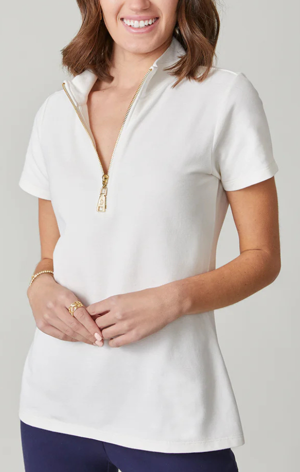 An easy everyday top created in a Peruvian Cotton blend knit. Featuring short sleeves, half zip neck, relaxed fit and a bright white. Style with denim and sneakers for a polished and clean on the go look.