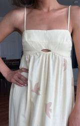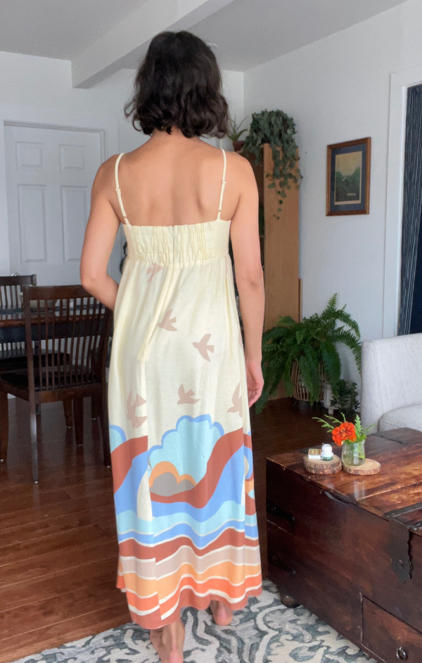 A dreamy summer maxi dress featuring a wavy earthy toned print, thin straps, square neckline, tiny front cutout and a flowy maxi length skirt. Style up with heels or wear casually with slides and gold jewelry.