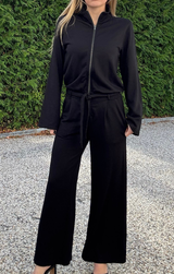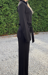 An ultra flattering wide leg jumpsuit to dress up with heels or wear casually with sneakers. Featuring a plunging neck, cross strap back, body hugging high waist and wide legs.